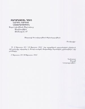 Արևմտահայոց հարցերի ուսումնասիրության կենտրոնն իր երախտագիտությունն է հայտնում սույն փաստաթղթերն օսմանյան արխիվում գտած, արևմտահայերեն թարգմանած և Akunq.net-ին տրամադրած ամերիկաբնակ պոլսահայ ուսումնասիրող Գևորգ Հակոբյանին: