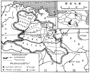 IXդ. 2–րդ կեսին Մոկքը ենթարկվել է Վասպուրականի Արծրունյաց իշխաններին։ Xդ. 2–րդ կեսին Բյուզանդիան ջանում էր իր ազդեցության տակ գցել Մոկքը, որպեսզի դյուրացնի Վասպուրականի նվաճումը։ Վասպուրականի թագավորության անկումից հետո թեև Մոկքը միացվեց Բյուզանդիային, սակայն այնտեղ Արծրունիները շարունակում էին ճանաչել Վասպուրականում մնացած Արծրունիների շառավիղներ Խեդենեկյանների գերակայությունը։