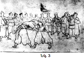Առանց նախազգուշացման՝ յանկարծ երեքը միասին տուն են մտնում: Պապը պարատեղ է պահանջում՝ ասելով՝ դէղ դվէք, բար բդէ խաղանք: Գրաւելով տան ամենամեծ սենեակը՝ պապն ու հարսը պարում են, նրանց միանում է արաբը ու պարի ընթացքում քաշքշում հարսին, փորձում է համբուրել. երկուսով սիրային խաղեր են խաղում: Պապը, արաբից փախցնելով հարսին, յետ է բերում: Արաբն էլ իր հերթին է փորձում պապից փախցնել հարսին: Այսպէս զուարճալի ձեւով կրկնում են խաղը մի քանի անգամ: Վերջացնելով՝ նուէրներ են ստանում ու գնում ուրիշ տուն:
