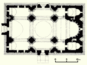 Չնայած ունի բազիլիկա պլան` նախագծի մեջ երկարացման շեշտ է նկատվում: Կառույցի երկարությունը բարձրության և լայնության համեմատ կարճ է, շեշտված է փնջաձև հենարանով և սյուներով: Սրանք կենտրոնական սյան շուրջը հավաքված քառակուսի և կիսաշրջանաձև սյուներ են, որոնցից կազմված բազմաթիվ օղագոտիները բարձրանալով ամբողջականանում են տանիքն ու գմբեթն ամրացնող կամարներով: