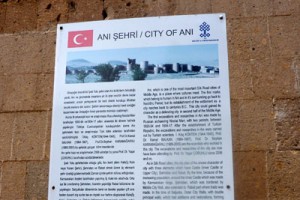 Ցուցանակը թուրքերեն եւ անգլերեն է: Չեխ զբոսաշրջիկը նկարեց այն, որպեսզի իր երեխաներին ցույց տա, նրանց հետ ուսումնասիրի եւ նրանց էլ փոխանցի Անիի պատմությունը, բնականաբար այն պատմությունը, որը ներկայացված է Անիի ավերակների ցուցանակների վրա: