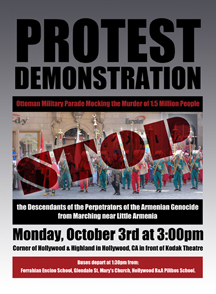 ՓՈՔՐԻԿ ՀԱՅԱՍՏԱՆ.- Երկուշաբթի, Հոկտեմբեր 3ին նախատեսուած Օսմանեան զինուորական նուագախումբի քայլարշաւի օրինակով ցուցադրական արարքը, Չորեքշաբթի, Սեպտեմբեր 28ին անակնկալօրէն ջնջուեցաւ, երբ զայն կազմակերպող թուրք-ամերիկեան «Փասիֆիքա» հիմնարկը որոշեց վերադարձնել քայլարշաւին համար իր ստացած արտօնագիրը, ըստ Լոս Անճելըսի ոստիկանութեան տուեալներուն:
