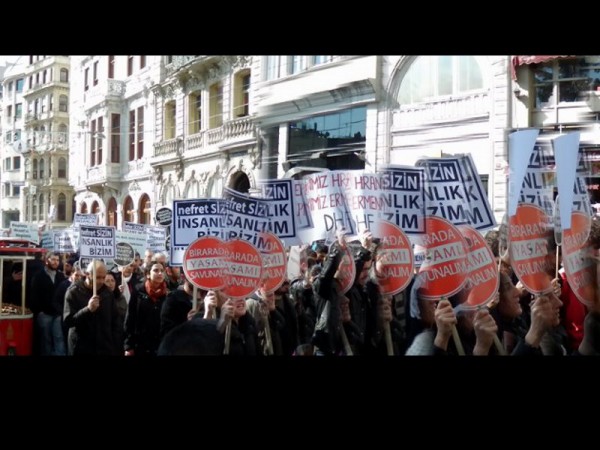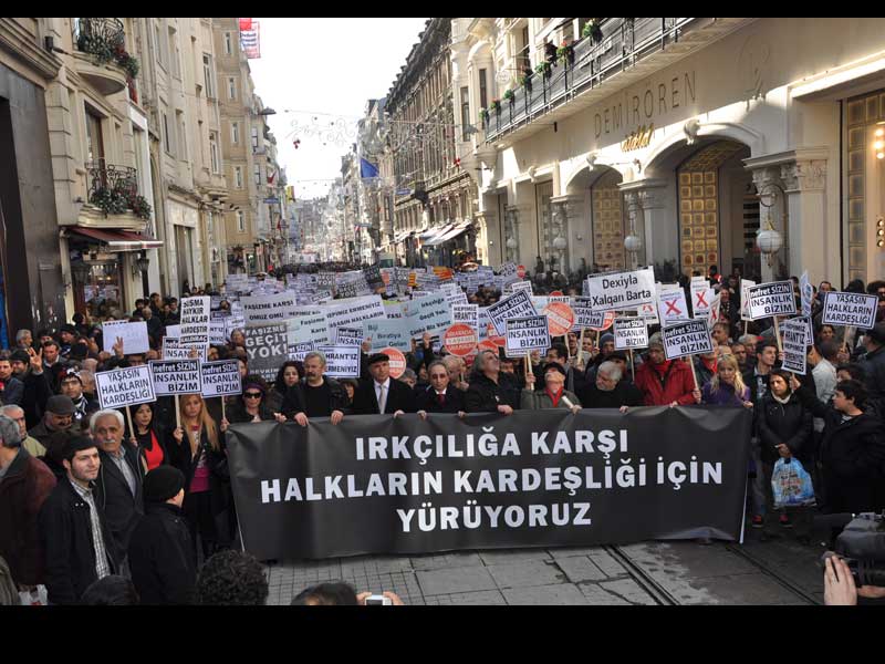 Քանի մը տարի առաջ աներեւակայելի էր, բայց այսօր կարելի դարձած է։ Թուրքիա հասած է այս կէտին։ Երէկ մօտաւորապէս հազար ցուցարարներ, որոնց միջեւ կային քաղաքագէտներ, լրագրողներ, դերասաններ, Կալաթասարայէն մինչեւ Թաքսիմ գնացք կատարեցին բողոքելու համար անցեալ Կիրակի Թաքսիմի մէջ Խոճալուի սպանդի տարեդարձին առթիւ պարզուած հակահայ տգեղ վերտառութիւններուն դէմ։ Ցուցարարները բողոքեցին հայերու դէմ կատարուած ցեղապաշտ այս գրգռութեան դէմ ու ըսին որ իրենք հոս են պաշտպանելու համար Հայերը։ Իրենք հոս են, բայց ի”նչ մեղք որ անտեսանելի կերպով հոն են նաեւ այն մեծ թիւով մարդիկը, որոնք այս երկրին մէջ տարիներ շարունակ լսեցին Հայերու դէմ թշնամական արտայայտութիւններ ու անոնցմով լեցուեցան։ Անոնք տակաւին մեծամասնութիւն չե՞ն կազմեր այս երկրին մէջ։