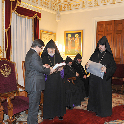 Մեծայարգ Նախարարն ու հետեւորդները առաջնորդուեցան պաշտօնական ընդունարան, ուր ընդունուեցան Պատրիարքական Ընդհանուր Փոխանորդ Բարձր. Տ. Արամ Ս. Արքեպս. Աթէշեանի կողմէ։ Մօտ կէս ժամուան մտերմիկ տեսակցութենէ ետք, Նախարարը առաջնորդուեցաւ դահլիճ ուր ներկայ էին Աթոռոյս միաբան հայրերը, համայնքային ու թաղային մարմիններու ատենապետները, համայնքային եւ տեղական մամլոյ աշխատակիցները։