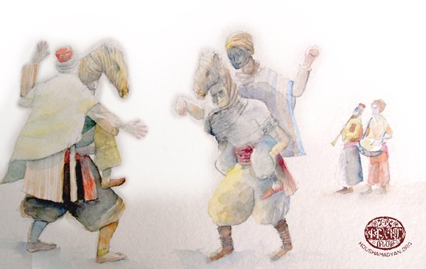 Բարեկենդանի զուարճութիւններէն՝ ուղտախաղը («տեւէ օյինի»)։ Գծագրութիւնը՝ Ժիւլիէթ Ինիկոյի կողմէ, Յուշամատեան