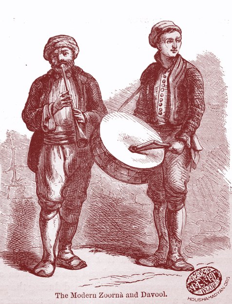 Զուռնա ու տհոլ նուագողներ (Աղբիւր՝ Henry J. Van-Lennep, Bible lands. Their modern customs and manners, part II, London, 1875)