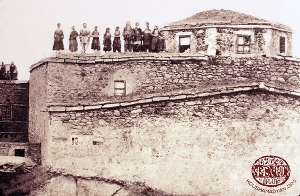 Հայ ընտանիք մը, Խարբերդ քաղաք, ca 1915։ Առաջին կարգի 5 երեխաները, ձախէն աջ՝ Մարկոսեան (անունը անծանօթ), անունը անծանօթ երեխայ մը, Մենտուհի Կոստանեան Էնկին, Սարգիսի որդին, Սարգիսի կողքին կանգնած կնոջ զաւակը։ Նստած, ձախէն աջ՝ Կարապետ («Աստրկագ») Քելճիքեան, Վերօնիքա(?) Ադամեան, Եղնար Ադամեան Կոստանեան։ Կանգնած, ձախէն աջ՝ Աղաւնի Քելճիքեան Մարկոսեան (հետագային Պալեան, Կարապետին մայրը), երկրորդէն հինգերորդը ներառեալ՝ անուննին անծանօթ անձեր, վեցերորդը՝ Սարգիս, Սարգիսի կինը, վերջին անձը՝ անծանօթ (Աղբիւր՝ Զապէլ Գալուստեան Կօշկարեանի հաւաքածոյ)