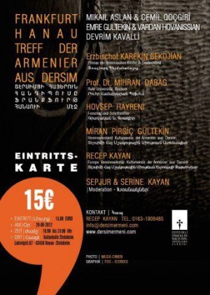 Դերսիմահայերը սեպտեմբերի 29-ին` շաբաթ օրը, մեկտեղվեցին Ֆրանկֆուրտից 20 կմ հեռավորության վրա գտնվող Հանաու քաղաքում: Հանդիպմանը որպես բանախոսներ հանդես եկան եպիսկոպոս Գարեգին Բեքչիյանը, Միհրան Փրկիչ Գյուլթեքինը, Հովսեփ Հայրենին, Ռեջեփ Մարաշլըն և Միհրան Դաբաղը, իսկ արվեստի գործիչներ` Միքայիլ Ասլանը, Դևրիմ Քավալլըն, Ջեմիլ Քոչգիրին, Վարդան Հովհաննիսյանը և Էմրե Գյուլթեքինը: Երեկույթը մեկնարկեց 1915 թ. Ցեղասպանության զոհերի հիշատակին հարգանքի տուրքի մատուցմամբ: Առաջինը ելույթ ունեցավ Գարեգին եպիսկոպոսը, ով իր խոսքն սկսեց դերսիմցի մի հայի մասին հուշով և շեշտեց սույն միջոցառման կարևորությունը: Երկրորդը ելույթ ունեցավ Դերսիմի հայերի հավատքի և սոցիալական փոխօգնության միության նախագահ Միհրան Փրկիչ Գյուլթեքինը, որը միության գործունեությանն անդրադառնալուց հետո խոսեց իրենց մարդկային իրավունքներից և սեփական ընտանիքի օրինակով ներկայացրեց այն հոգեկան տրավման, որ ապրել են Հայոց ցեղասպանությունից փրկված հայերը: Գյուլթեքինը հայտնելով, որ իրենք մտադիր են Դերսիմում եկեղեցիներին վերաբերող մի նախագիծ իրականացնել, նշեց նաև, թե շուտով կնկարահանվի դերսիմահայերին նվիրված վավերագրական ֆիլմ, և խոսեց միության խնդիրների մասին: Հովսեփ Հայրենին առավելապես ներկայացրեց Դերսիմի հայության պատմությունը` ընդգծելով, որ հնում Դերսիմը ինքնավար շրջան է եղել և ցանկացել է այդպիսին մնալ: Ռեջեփ Մարաշլըն իր հերթին փորձեց օրինակներով հայտնել, որ անցյալում Դերսիմում էլ են անօրինականություններ կատարվել: Ինչ վերաբերում է Միհրան Դաբաղին, ապա վերջինս նշելով, թե ծագմանը վերադառնալուն ուղղված ջանքերն իմաստալից են, անդրադարձավ այն անօրինականություններին, որոնց անցյալում ենթարկվել էր Դիարբեքիրում: Երեկույթն ավարտվեց ժամը 23.00-ին` արվեստի գործիչ ընկերների կողմից ներկայացված համերգից հետո: Ուշագրավ էր, որ երեկույթի մասնակիցների շարքում կային նաև ամերիկաբնակներ, կանադաբնակներ, շվեդաբնակներ և ֆրանսաբնակներ: Ցավոք, գերմանաբնակ դերսիմահայերի մասնակցությունը բավարար չէր, սակայն մասնակիցները մեծ հետաքրքրություն ցուցաբերեցին: Արդյունքի առումով մեր միությունը հասավ իր նպատակին. Դերսիմի հայության խնդիրները բարձրաձայնվեցին ողջ Եվրոպայում: