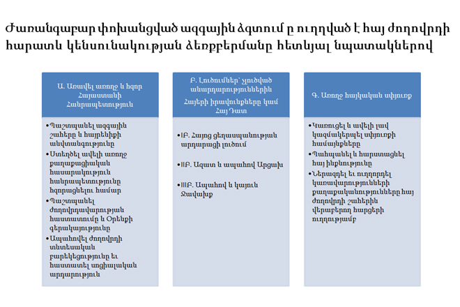 ա) Հայ ազգի կենսունակությանն ուղղված բոլոր երեք նպատակները, այսինքն, ուժեղ եւ առողջ հայկական պետությունը, չլուծված խնդիրների կարգավորումները (Ցեղասպանություն, Ղարաբաղ և Ջավախք) և կազմակերպված հայկական սփյուռքի կենսունակության ամրապնդումը նույն շղթայի ինտուիտիվ օղակներն են եւ անքակտելիորեն կապված են հայ ժողովրդի վերջնական ճակատագրի հետ: Ներկայում գոյություն ունի համոզմունք, որ անհրաժեշտ է ստեղծել մեկ համակարգված քաղաքականություն այս երեք նպատակների միջև: