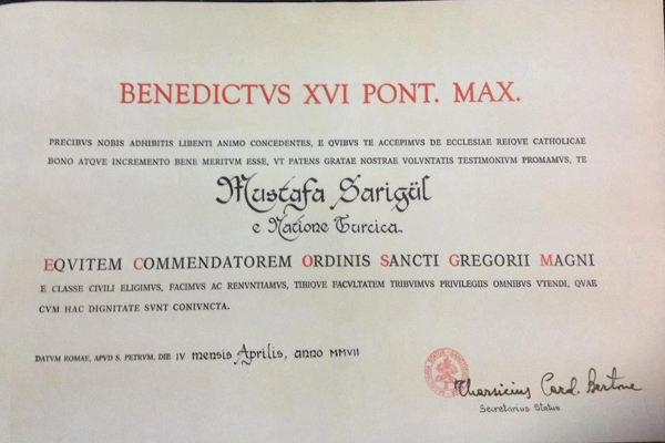 Եվ ահա 2012թ. դեկտեմբերի 8-ին Վատիկանի մամլո ծառայությունը տեղեկացնում է, որ Հռոմի պապ Բենեդիկտոս 16-րդը Ստամբուլի Շիշլիի քաղաքապետ Մուսթաֆա Սարընգյուլին պարգևատրել է կաթոլիկ եկեղեցու ամենաբարձր շքանշանով` հայերին և եկեղեցուն մատուցած ծառայությունների համար: