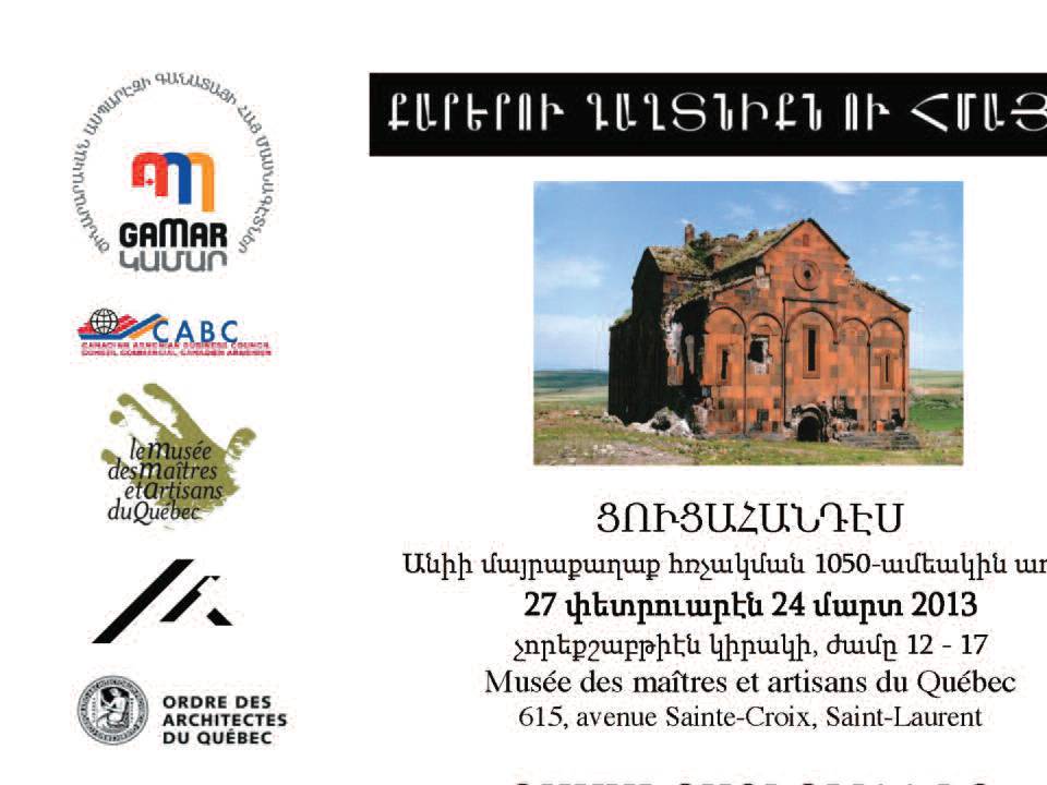 Յիշատակելու համար այս կարեւոր յոբելեանը, Գանատայի հայ առեւտրական խորհուրդի Կամար ճարտարապետական-ճարտարագիտական յանձնախումբի կազմակերպութեամբ ու մասնակցութեամբ Մոնթրէալի հայ մշակութային միութիւներուն, ինչպէս նաեւ զօրակցութեամբ Քեպէգի Ճարտարապետներու կարգին (Ordre des architectes du Québec), Սէն-Լօրանի Musée des maîtres et artisans du Québec թանգարանէն ներս, 27 փետրուարէն 24 մարտ 2013 տեղի պիտի ունենայ ցուցահանդէս մը: Պիտի կազմակերպուին նաեւ դասախօսութիւններ Մոնթրէալի, Թորոնթոյի եւ Օթթաուայի քաղաքներու հայ համայնքային կամ մշակութային կեդրոններուն մէջ։