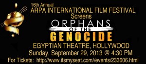 ԼՈՍ ԱՆՃԵԼԸՍ.- Շարժապատկերի, երաժշտութեան եւ արուեստի Արփա հիմնարկի (AFFMA) «Արփա» շարժապատկերի միջազգային 16րդ փառատօնի մրցանակին թեկնածու ֆիլմերէն մէկն է Պարէտ Մարոնեանի «Ցեղասպանութեան որբերը» վաւերագրական շարժապատկերը, որ պիտի ցուցադրուի կիրակի, սեպտեմբեր 29ին, կ.ե. ժամը 4:30ին, Հոլիվուտի «Իճիփշըն» թատերասրահին մէջ: 13 տոլար արժող տոմսերը կարելի է ապահովել՝ այցելելով www.itsmyseat.com//events/233606.html կայքէջը:
