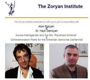 Տորոնտոյի (Կանադա) Սբ. Գրիգոր Լուսավորիչ Հայ Կաթողիկե եկեղեցում Երևանի ժամանակով նոյեմբերի 7-ի վաղ առավոտյան ՀՑԹԻ տնօրեն Հայկ Դեմոյանի և աշխարհահռչակ կանադահայ կինոռեժիսոր Ատոմ Էգոյանի մասնակցությամբ տեղի ունեցավ քննարկում՝ նվիրված Ավրորա Մարտիկանյանի «Հոշոտված Հայաստան» գրքին և Հայոց ցեղասպանության 100-րդ տարելիցի հիշատակումների ծրագրերին: Քննարկումը կազմակերպել էր Զորյան ինստիտուտը: