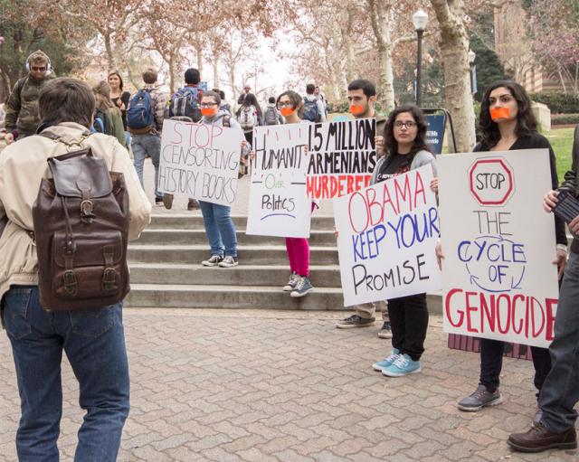 ԼՈՍ ԱՆՃԵԼԸՍ.- Նախաձեռնութեամբ Համահայկական ուսանողական միութեան՝ Քալիֆորնիոյ համալսարանի զանազան մասնաճիւղերու, Հարաւային Քալիֆորնիոյ համալսարանի, ինչպէս նաեւ կարգ մը սեփական համալսարաններու Հայ ուսանողական միութիւնները հինգշաբթի, յունուար 30ին կրցան Հայոց Ցեղասպանութիւնը ուրանալու ջանքերը դատապարտող իրենց համակարգուած ցոյցերուն վրայ յատկանշական ուշադրութիւն գրաւել համալսարաններէն ներս ու համացանցի ընկերային ցանցերուն վրայ, որոնց մէջ Հայոց Ցեղասպանութեան հարցը, հինգշաբթի յետմիջօրէին, դարձած էր քննարկուած գլխաւոր հարցերէն մէկը: