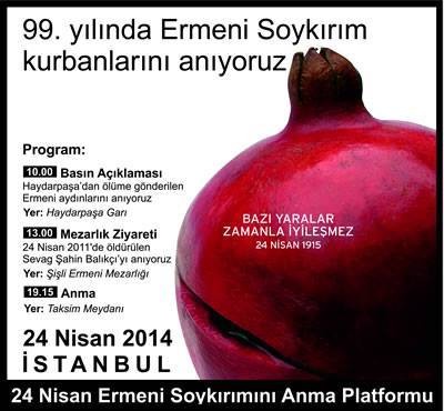 Ապրլիլ 24-յան ոգեկոչման միջոցառումներն այս տարի մեկնարկելու են առավոտյան ժ. 10-ին Հայդարփաշա նավամատույցից, որտեղից աքսորի են ուղարկել հայ մտավորականներին: Միջոցառման կազմակերպիչները հանդես են գալու մամլո ասուլիսով: Այնուհետև ժ. 13:00 այցելելու են Շիշլիի գերեզմանատուն` հարգանքի տուրք մատուցելու Սևակ Շահին Բալըքչըին, ով երեք տարի առաջ` ապրիլի 24-ին, սպանվեց բանակում: Միջոցառումների շարքն ավարտվելու է ժ. 19:15` Թաքսիմի հրապարակում ցեղասպանության անմեղ զոհերի ոգեկոչման արարողությամբ: