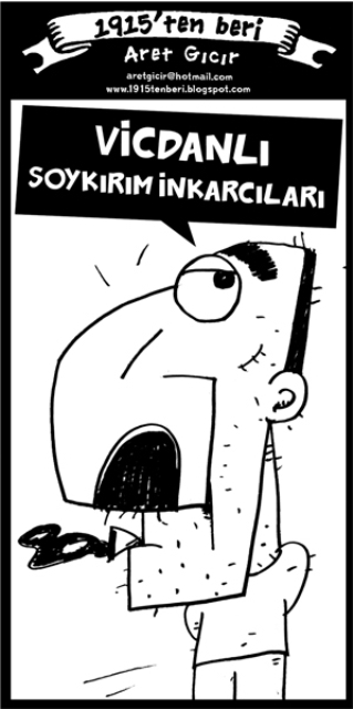 Ցեղասպանությունը ժխտող «խղճով» մարդիկՍտամբուլահայ ծաղրանկարիչ Արեթ Գըջըրի հերթական ծաղրանկարը նվիրված է Թուրքիայի վարչապետ Ռեջեփ Թայիփ Էրդողանի՝ հայերին ուղղված ուղերձին, որտեղ ցավակցություն էր հայտնել մահացածներին, սակայն չէր հեռացել ժխտողական քաղաքականությունից։