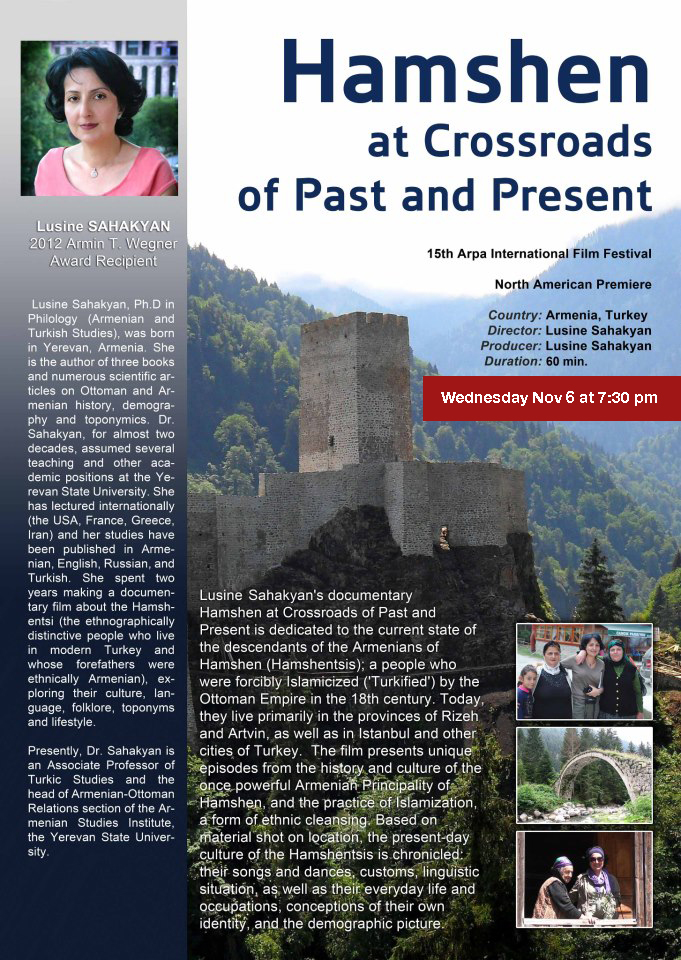 Սույն թվականի հունիսի 25-ին, ժամը 18:30-ին Արևմտահայոց հարցերի ուսումնասիրության կենտրոնում, ՀԵՀ-ի՝ որպես ՀՀ նախագահի կողմից գործընկեր կազմակերպության հայտարարած` «Հայության խնդիրներն ու իրավունքները Թուրքիայի Հանրապետությունում» անվանակարգով դրամաշնորհի շրջանակում, «Հասարակություն եւ մշակույթ» ՀԿ-ն կկազմակերպի «Համշենը անցյալի և ներկայի խաչմերուկներում» վավերագրական ֆիլմի ցուցադրությունը և հանդիպում ֆիլմի հեղինակ` թուրքագետ, բանասիրական գիտությունների թեկնածու Լուսինե Սահակյանի հետ: Ֆիլմի դիտումից հետո տեղի կունենա քննարկում, և հանդիսատեսների հարցերին կպատասխանի ֆիլմի հեղինակը: