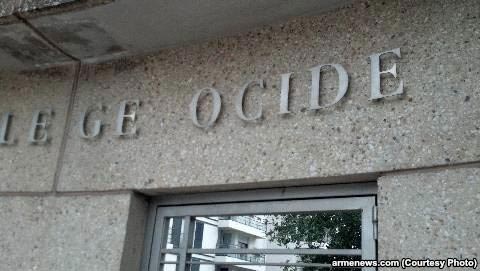 Հանուած են յուշարձանին վրայ տեղադրուած գրութեան տառերէն մի քանին, ինչ որ անկարելի դարձուցած է կարդալ այդ գրութիւնը, որ կը վերաբերի Հայոց ցեղասպանութեան ճանաչման: