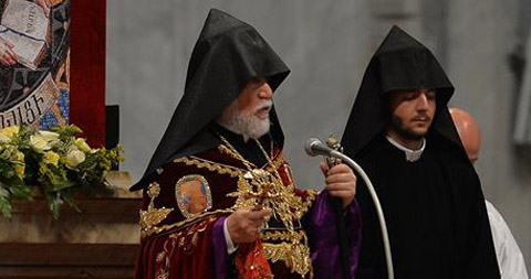 Անդրադառնալով Ֆրանչիսկոս Պապին Պատարագին սկիզբը կատարած յայտարարութեան, թէ «Հայոց Ցեղասպանութիւնը 20-րդ դարու առաջին ցեղասպանութիւնն է», Նորին Սուրբ Օծութիւնը իր երախտագիտութիւնը յայտնեց եւ յիշեցուց, որ Պենետիկտոս 15-րդ Պապը 1915-ի ջարդերու ժամանակ նամակ յղած էր սուլթանին, հայ ժողովուրդին դէմ կատարուած ջարդերը դադրեցնելու։ Ապա, Վեհափառ Հայրապետը գնահատանքով յիշեց հայ ժողովուրդին արդար դատին նկատմամբ Վատիկանի ցուցաբերած զօրակցութիւնը ցեղասպանութեան յաջորդող տարիներուն։ Յայտնենք, որ Ն.Ս.Օ.Տ.Տ. Արամ Ա. Կաթողիկոս իր խօսքին առաջին բաժինին մէջ հայերէնով արտայայտուեցաւ, յիշելով նահատակներու դերը եկեղեցւոյ կեանքին ու վկայութեան մէջ, նաեւ անդրադառնալով Ս. Գրիգոր Նարեկացիին որպէս մեծ աստուածաբան։