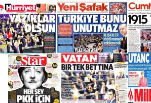 «Հուրրիյեթ»-ի առաջին էջին «Ամո՛թ ձեզ» վերնագիրն է. նյութում նշվում է, որ Գերմանիայի կանցլեր Անգելա Մերկելը քվեարկությանը չի մասնակցել, Թուրքիայի նախագահ Ռեջեփ Թայիփ Էրդողանի հայտարարություններն առաջին պլան են մղվում։