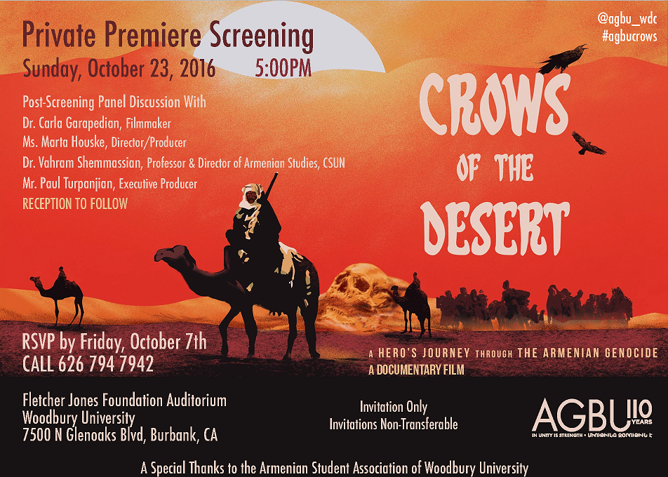 ՊԸՐՊԵՆՔ.- ՀԲԸՄի 110ամեակին նուիրուած ձեռնարկներու ծիրէն ներս, Կիրակի, Հոկտեմբեր 23ին, կ.ե. ժամը 5ին, «Ուուտպըրի» համալսարանի «Ֆլեչըր» սահին մէջ տեղի պիտի ունենայ Հայոց Ցեղասպանութեան մասին վաւերագրական «Անապատի ագռաւներ» («Crows of the Desert») վաւերագրական ֆիլմի յատուկ ցուցադրութիւնը։