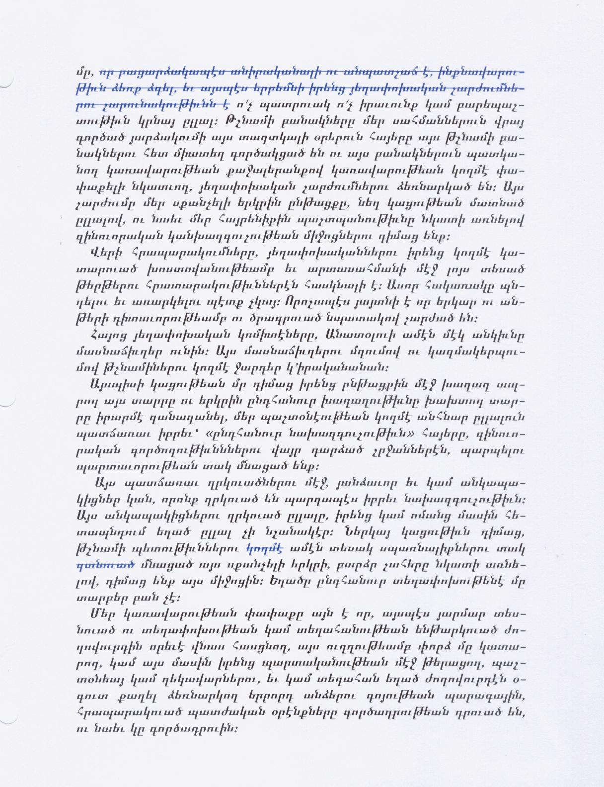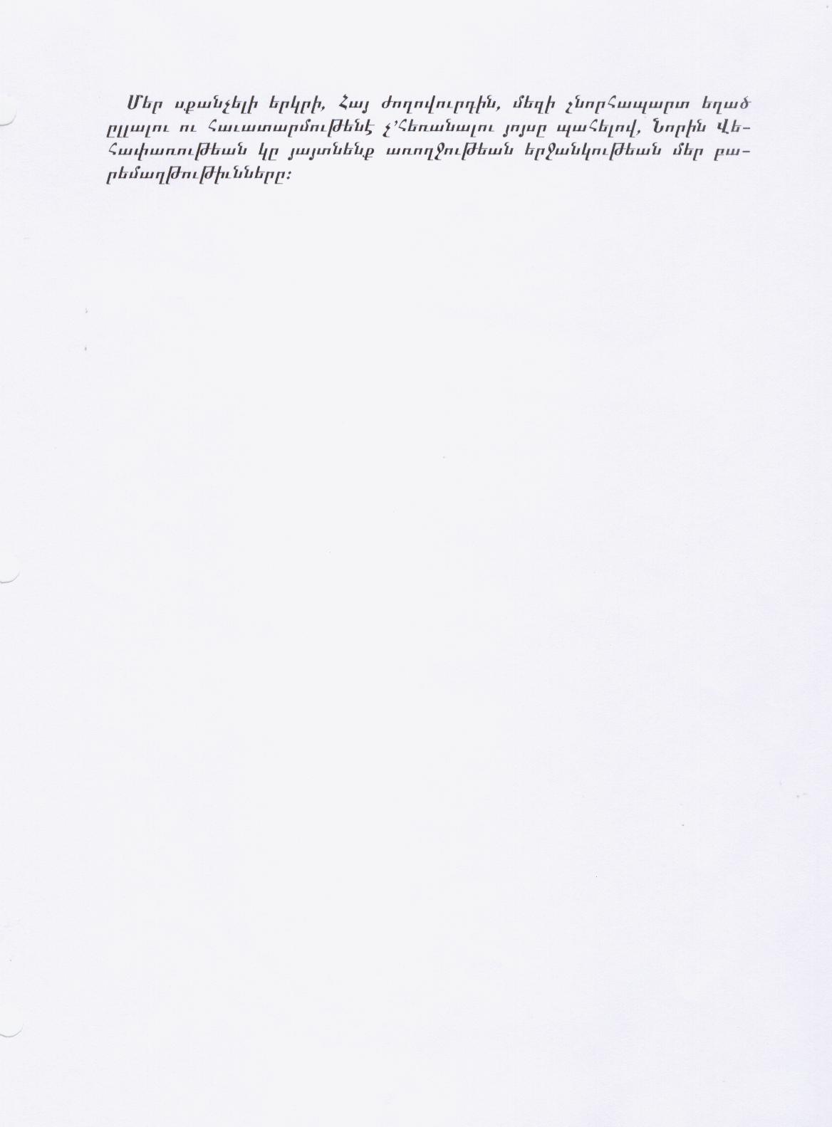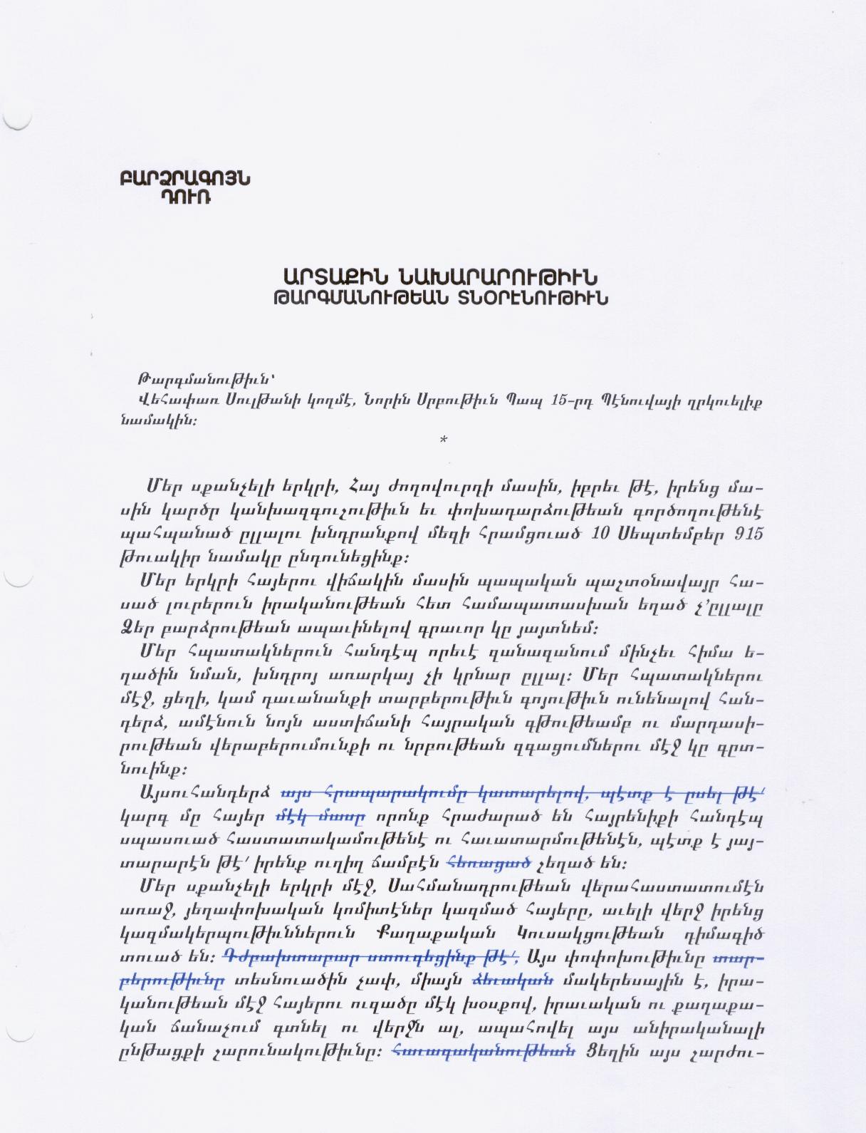 Ստորև Akunq.net-ի ընթերցողներին ենք ներկայացնում Հայոց ցեղասպանության ժամանակ օսմանյան սուլթան Մեհմեդ V Ռեշադի (1909-1918) պատասխան նամակը` ուղղված ժամանակաշրջանի Հռոմի պապ Բենեդիկտոս XV-ին: Փաստաթուղթը սիրով Արևմտահայոց հարցերի ուսումնասիրության կենտրոնին է տրամադրել այն օսմանյան վարչապետարանի արխիվում գտած և արևմտահայերեն թարգմանած ամերիկաբնակ պոլսահայ ուսումնասիրող Գևորգ Բ.Հակոբյանը, որի համար կենտրոնն իր երախտագիտությունն է հայտնում նրան: