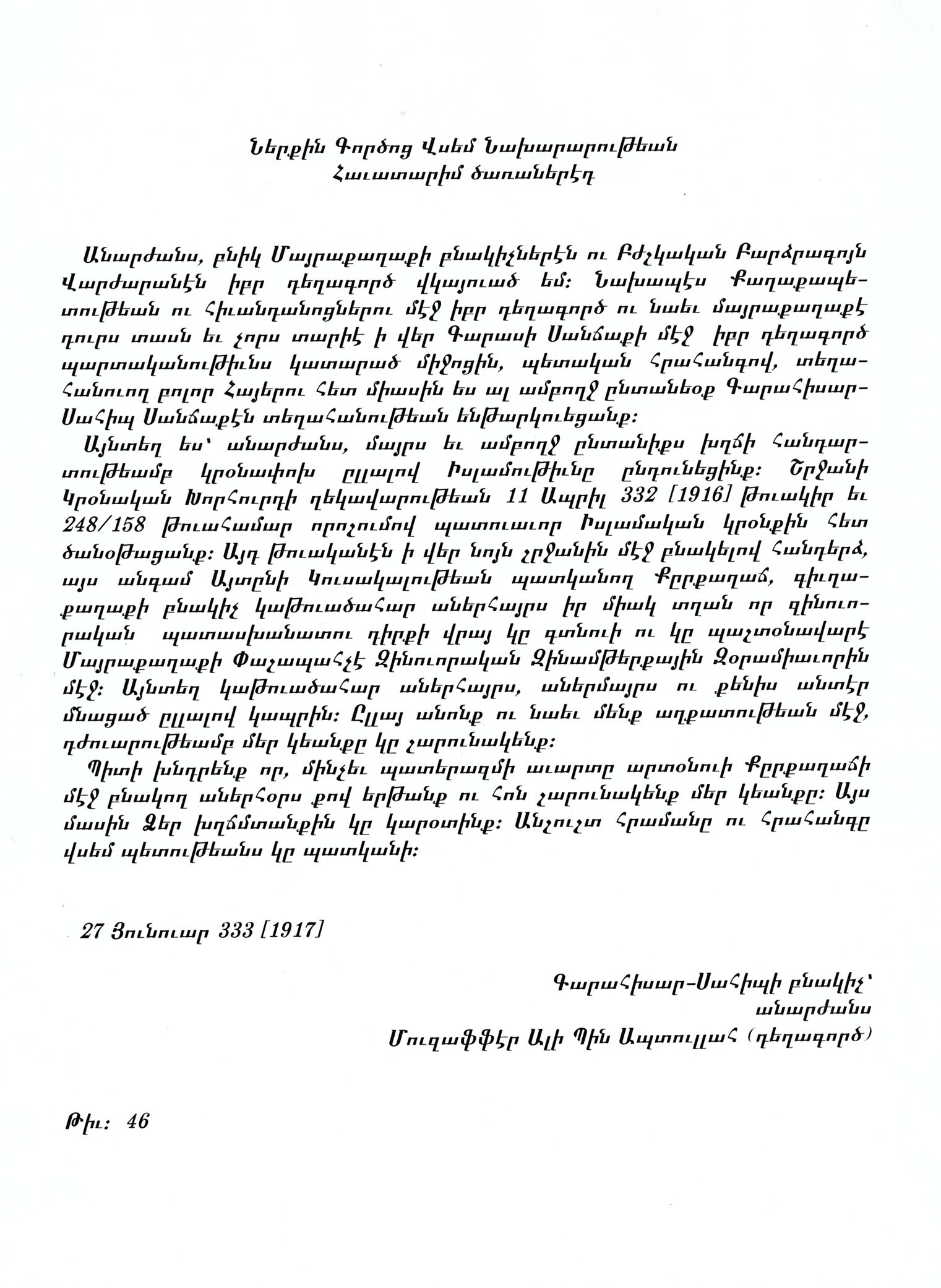 Փոխադրվել ցանկացող մի կրոնափոխ հայ ընտանիքի դիմումը օսմանյան կառավարությանը