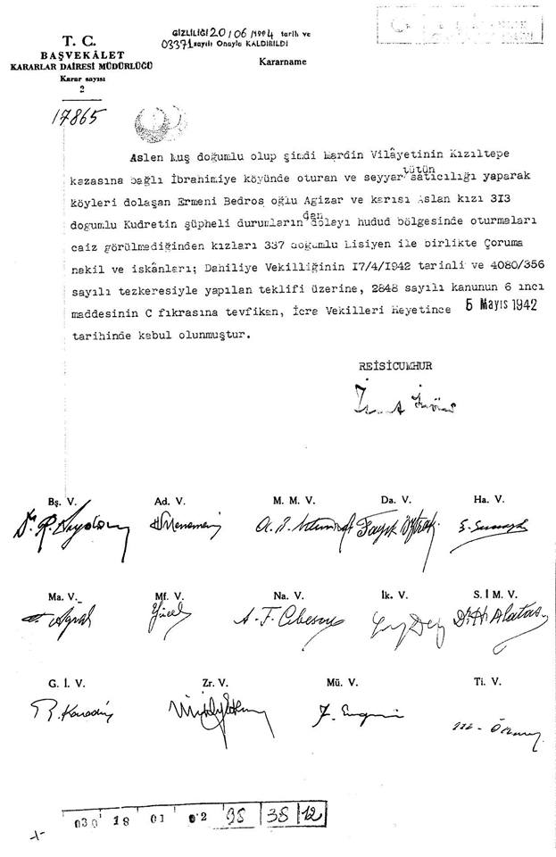 «Քանի որ արմատներով Քուշ (գտնվում է ներկայիս Թուրքիայի Գիրեսուն/Կերասուն նահանգի Չանաքչը գավառում-Ակունքի խմբ.) գյուղից ծագող, իսկ ներկայում Մարդինի նահանգի Քըզըլթեփե գավառին ենթակա Իբրահիմիյե գյուղում բնակվող և շրջիկ վաճառականությամբ զբաղվելով` գյուղերում շրջող հայ` Պետրոսի որդի Ագիզարի և նրա կնոջ` 313 թ. ծնված` Ասլանի աղջիկ Քուդրեթինի պահվածքը կասկած է հարուցել, անթույլատրելի է, որ նրանք ապրեն սահմանային շրջանում: Վճռվել է նրանց` դստեր` 337 թ. ծնված Լիսիյենի հետ միասին տեղափոխել ու վերաբնակեցնել Չորումում: Սույն որոշումը Նախարարների խորհրդի կողմից կայացվել է 1942 թ. մայիսի 5-ին, Ներքին գործերի նախարարության կողմից 1942 թ. ապրիլի 17-ին արված թիվ 4080/356 առաջարկից հետո` 2848 թվակիր օրենքի 6-րդ հոդվածի երրորդ պարբերության համաձայն: