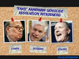 ՈՒԱՇԻՆԿԹԸՆ.- Հայոց Ցեղասպանութեան յստակ ճանաչումը ապահովելու եւ ապագայ ցեղասպանութեանց առաջքը առնելու նպատակով հանրապետական եւ դեմոկրատ քոնկրեսականներու կողմէ յառաջ մղուող թիւ 220 բանաձեւը ձախողութեան մատնելու նպատակով, Ներկայացուցիչներու տան մէջ Հայոց Ցեղասպանութիւնը ուրացող երեք քոնկրեսականներ ներկայացուցած են ՀայաստանԹուրքիա յարաբերութեանց առնչուող բանաձեւ մը, ուր ոչ մէկ նշում կայ Ցեղասպանութեան։