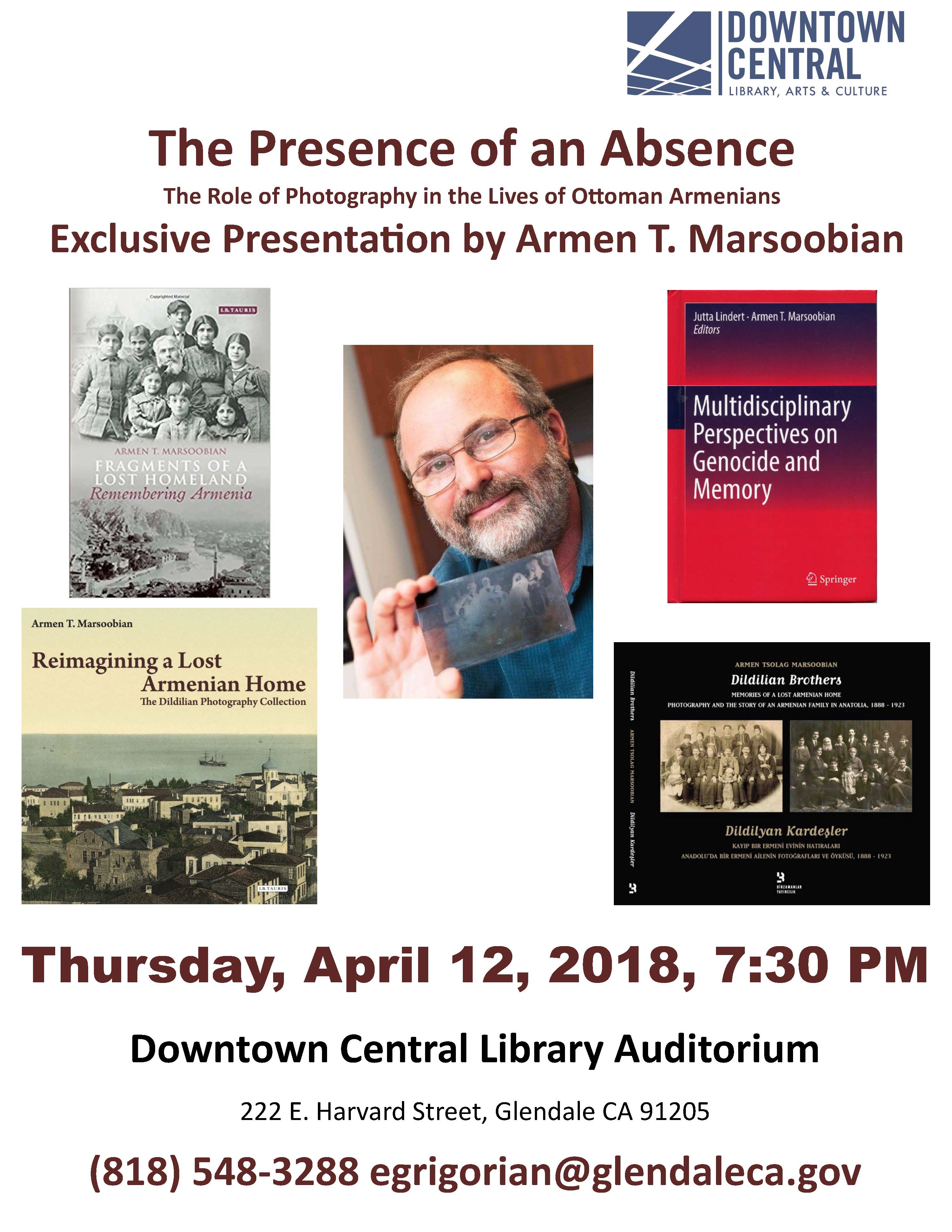 ԿԼԵՆՏԷՅԼ.- Հինգշաբթի, ապրիլ 12ին, երեկոյեան ժամը 7:30էն սկսեալ, Կլենտէյլի Կեդրոնական գրադարանի սրահին մէջ (222 East Harvard Street, CA 91205) տեղի պիտի ունենայ Օսմանեան կայսրութեան հայերու կեանքին մէջ լուսանկարչութեան դերին  նուիրուած քննարկում մը։