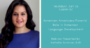 ԿԼԵՆՏԷՅԼ.- Կազմակերպութեամբ Ամերիկահայ ճարտարագէտներու եւ գիտնականներու ընկերակցութեան, Հինգշաբթի, 23 Յուլիսին, երեկոյեան ժամը 7։30էն սկսեալ, համացանցային «Զում» հարթակին միջոցաւ տեղի պիտի ունենայ հայերէնի զարգացման եւ անոր մէջ ծնողներու դերին նուիրուած առցանց քննարկում մը։