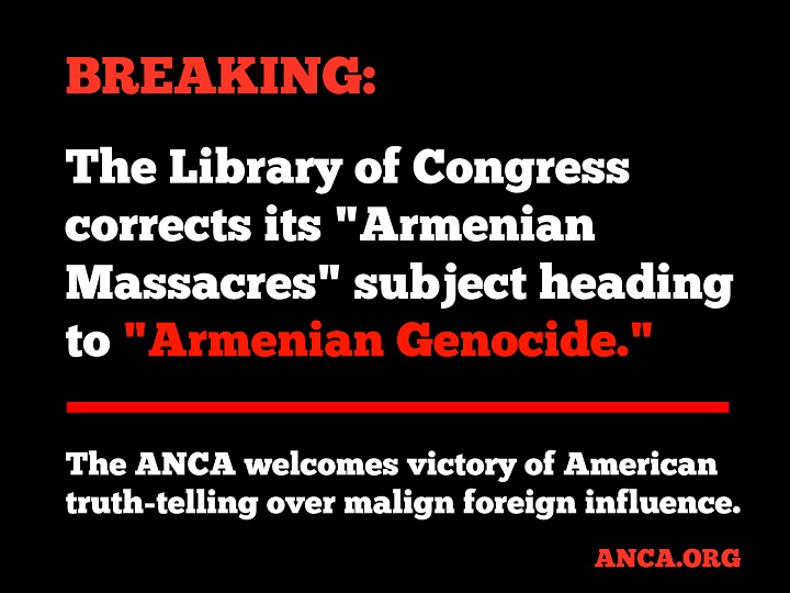 ՈՒԱՇԻՆԿԹԸՆ.- Ամերիկայի Հայ Դատի յանձնախումբին նախաձեռնած եւ մեծ թիւով քոնկրեսականներու աջակցութիւնը ապահոված արշաւին շնորհիւ, Քոնկրեսի գրադարանի ղեկավարութիւնը վերջապէս որոշեց սրգաբրել Հայոց Ցեղասպանութիւնը «Հայկական ջարդեր» կոչելու իր սխալը: