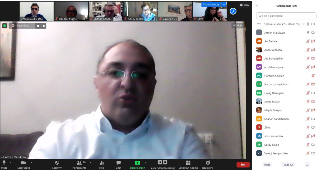 «Ազդակ»-ի առցանց 18-րդ լսարանին զեկուցեց Հայաստանի գիտութիւններու Ազգային Ակադեմիայի պատմութեան հիմնարկի Հայկական հարցի եւ Հայոց ցեղասպանութեան պատմութեան բաժնի վարիչ դոկտ. Արմէն Մարուքեան: