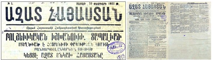 1. Հայրենիքի Փրկութեան Կոմիտէի՝ Հայաստանի Հանրապետական Կառավարութեան օրկան «Ազատ Հայաստան» օրաթերթի առաջին թիւը՝ 19 Փետրուար 1921: