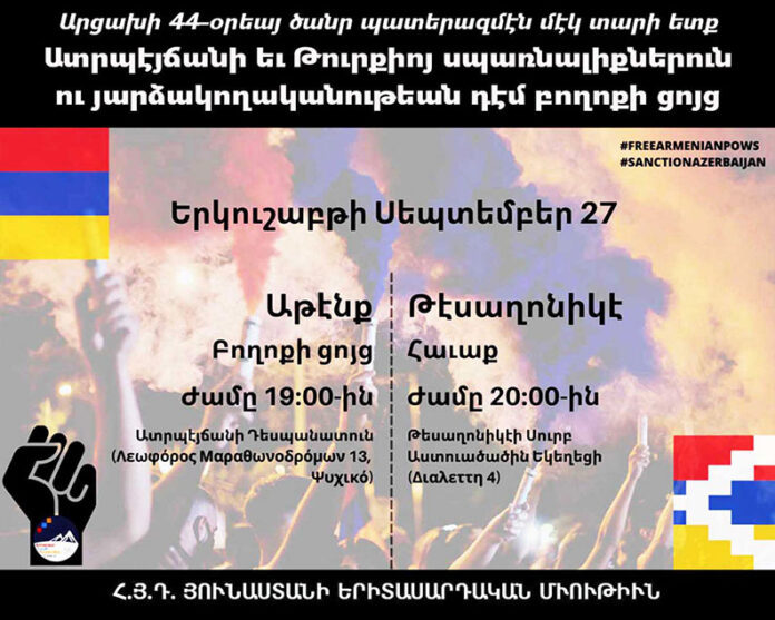 Երկուշաբթի, 27 սեպտեմբերին, ժամը 19։00-ին, Արցախի 44-օրեայ ծանր պատերազմէն մէկ տարի անց, Աթէնքի մէջ Ազրպէյճանի դեսպանատան դիմաց, Ազրպէյճանի եւ Թուրքիոյ սպառնալիքներուն եւ յարձակողականութեան դէմ բողոքի ցոյց պիտի իրականացնէ ՀՅԴ Յունաստանի Երիտասարդական Միութիւնը։