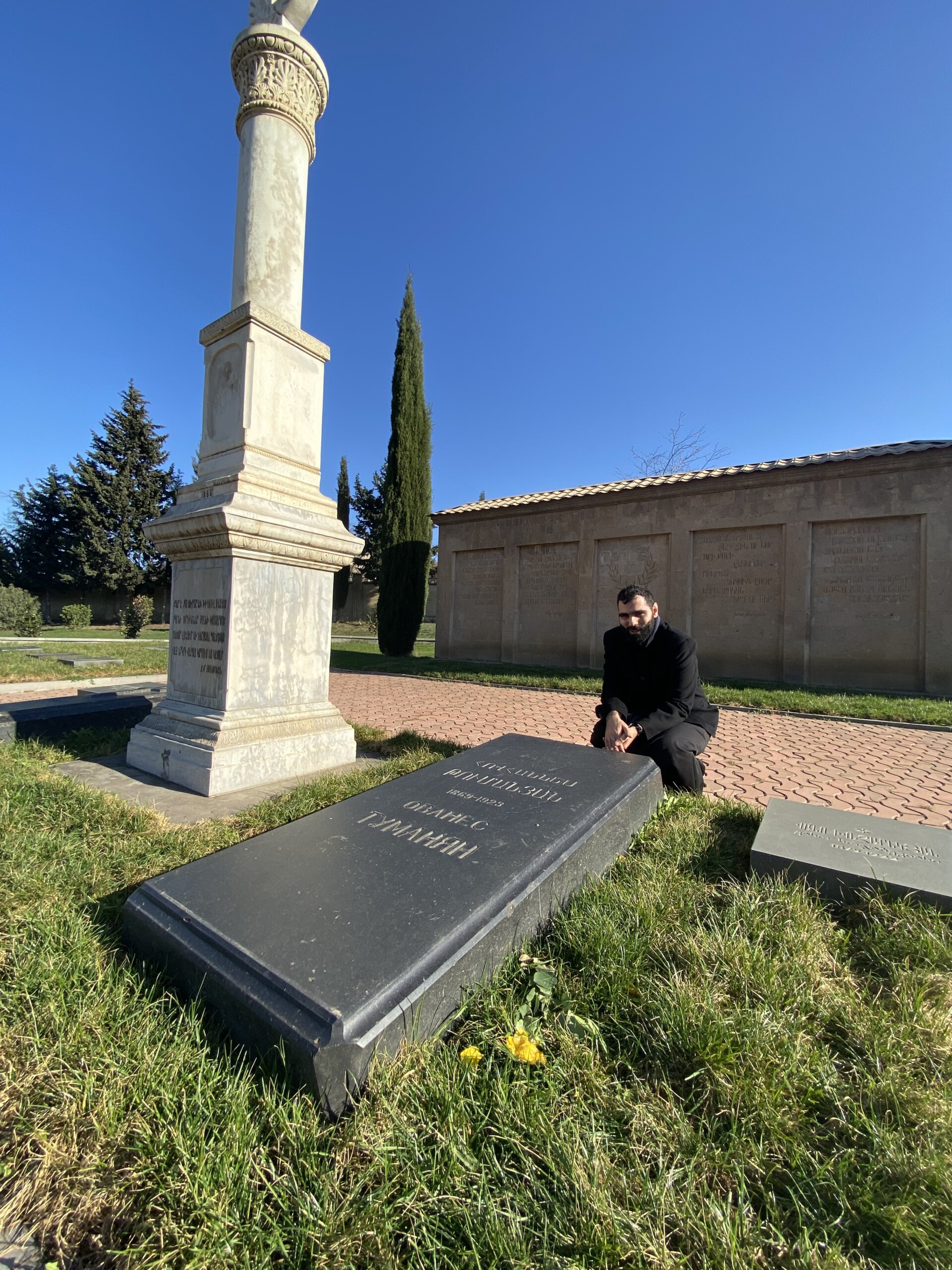Սայաթ Նովայի օրհնալի ներկայութենէ բաժնուելէ յետոյ, ուղղուեցանք դէպի՝ Պանթէոն, ուր կը գտնուի Ամենայն Հայոց Բանաստեղծ Յովհաննէս Թումանեանի գերեզմանը։ Թիֆլիզի մէջ բազմաթիւ գրական դէմքերու մօտ, կարծէք կ՚առանձնանար Թումանեանը, Նովայէն մօտաւորապէս 100 տարիներ յետոյ ի յայտ եկած մեծ բանաստեղծը, որ սեռած էր հոգեւորականի ընտանիքէն։ Նախապէս աճիւնները կը գտնուէին Խոջիվանքի գերեզմանատան մէջ, սակայն ժամանակօք գերեզմանը աւերուած ըլլալուն, Թումանեանի գերեզմանը տեղափոխուած էր Հայ Գործիչներու նորաստեղծ պանթէոն։ Այստեղ կը վերյիշէի այն հետաքրքական դէպքը, թէ՝ Թումանեանի վախճանումէն յետոյ, իր բազմաթիւ զաւակներէն մին՝ Արեգը, Թումանեանի սիրտը կը տանէր իր մօտ եւ տարիներ շարունակ կը պահէր այս սիրտը. «Ես մի քայլ արեցի…ես հայրիկի սիրտը գողացա։ Ճիշտ ա, պէտք է շատ հանդուգն լինել, որ գողանալ էն սիրտը, որ գրկում էր ամբողջ աշխարհը, պետք է շատ իրեն կորցնել, որ մոտ գալ, բայց իմ սիրտը չդիմացավ։ Գողացա։ Գուցե մեղադրում ես։ Ոչինչ։ Թող իմ սուրբ հոր սիրտը լինի մեր տանը։ Ճիշտ ա, նա չի բաբախում, բայց չէ՞ որ նա մեզ հետ ա ապրել, չէ՞ որ հայրիկը ամբողջ սրտի մեջ ա, և հայրիկի սիրտը պետք է մեր տանը լինի…»։