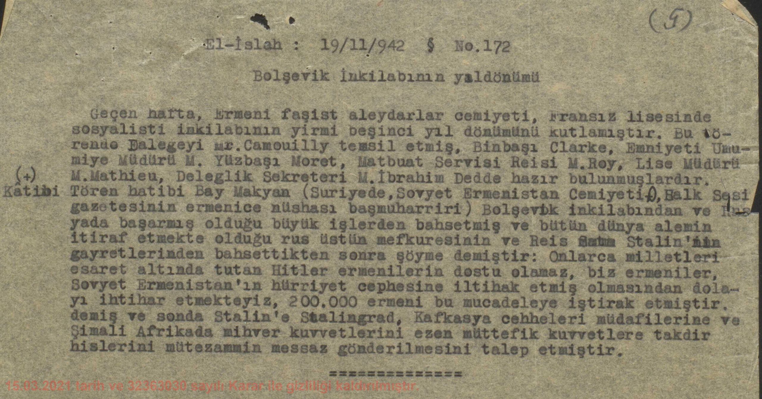 (Թուրքիայի-Ակունքի խմբ․) Արտգործնախարարության մի փաստաթղթից, որը 2021 թվականից դադարել է գաղտնի պահվել, հասկանում ենք, որ հեղափոխական հայերը հետապնդվում էին։ Հալեպի հյուպատոսը 26.11.1942 ամսաթիվին նախարարությանը հղած իր գրության մեջ զեկուցում է, որ Հակաֆաշիստական հայկական ընկերությունը նշել է Բոլշևիկյան հեղափոխության 25-րդ տարելիցը և ներկայացնում միջոցառման մասնակիցների ցանկը։ Ինչպես պարզ է դառնում այդ ցանկից, բարձր մակարդակի մասնակցություն է ապահովվել։ Հյուպատոսը հատկապես ընդգծում է այդ հանգամանքը։
