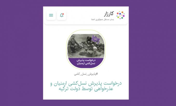 Հայոց Ցեղասպանութեան 107-րդ տարելիցի ոգեկոչման ծրագրերու ուղղութեամբ կազմակերպուած է ստորագրահաւաք՝ իրանական «Քարզար» հարթակով՝ իբրեւ աջակցութիւն Հայոց Ցեղասպանութեան պահանջատիրութեան: Այս մասին ԵՌԱԳՈՅՆ-ը կը տեղեկանայ «Ալիք»-էն։