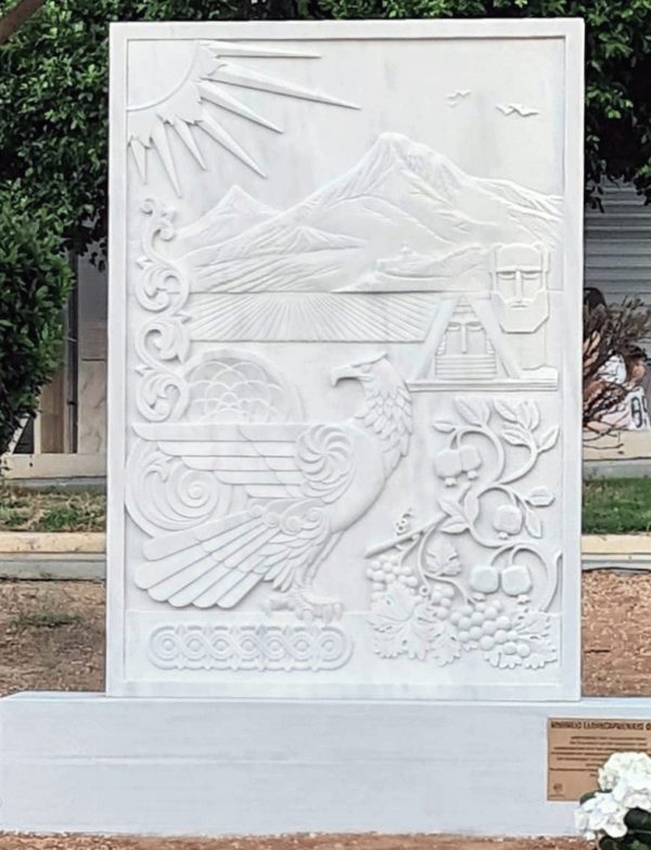 Յունական սպիտակ մարմարով քանդակուած յուշակոթողը իւրայատուկ ստեղծագործութիւն մըն է, որուն վրայ կ՚արտացոլան հայ մշակոյթի ամէնէն յատկանշական նմուշները։ Արեւը՝ որպէս լոյսի, բարութեան եւ արդարութեան խորհրդանիշ, զոյգ Մասիսները, Նուռը՝ որպէս վերածնունդի ու բարօրութեան նշան, Որթատունկը՝ որպէս Հայաստանի անուշ գինիի հազարամեայ գանձ, Արծիւը՝ հայ ժողովուրդի քաջութեան ու խիզախութեան խորհրդանիշ։ Խոր Վիրապը կը յիշեցնէ, թէ հայ ժողովուրդը 301 թուականին առաջին ընդունեց քրիստոնէական հաւատքը, իսկ Արցախի խորհրդանիշը՝ Մամիկն ու Պապիկը, կը կանգնի մեր խրոխտ լեռներուն վրայ, հայը կը կապէ իր արմատներուն ու կը յիշեցնէ, թէ «Մենք ենք մեր սարերը»։