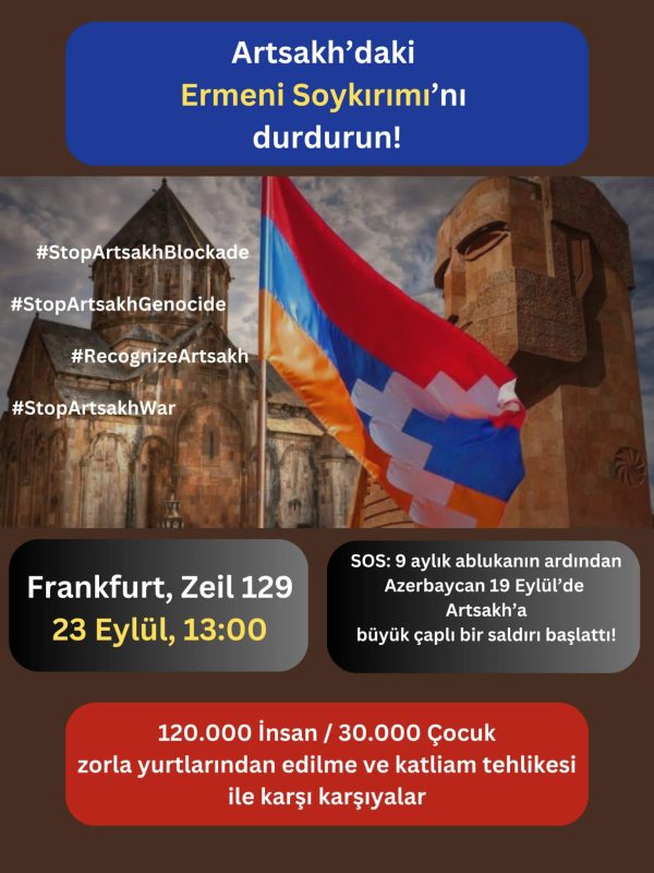 Ֆրանկֆուրտում արդեն 25 տարի անընդմեջ գործող Միություն ընդդեմ Ցեղասպանության թուրք եւ քուրդ անդամները միջազգային հանրությունից պահանջում են շտապ ճանաչել Արցախի Հանրապետությունը և հարգել արցախահայության ինքնորոշման իրավունքը։ Կազմակերպության ֆեյսբուքյան էջում հրապարակված հայտարարության մեջ նրանք նաև շեշտել են, որ Արցախի 120 հազար հայերը նորից ցեղասպանվելու վտանգի տակ են։