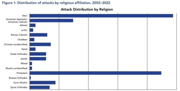 Այսպես, 2003-2022 թթ. ընթացքում Թուրքիայում հարձակումների ենթարկված կրոնական գույքի պատկանելիության առումով հայկականը երրորդ տեղում է (ընդհանուր առմամբ գրանցված 34 դեպք)։ Հայկականից զատ ավելի շատ է տուժել միայն ալևիներին ու բողոքականներին պատկանող գույքը։ Հայկական եկեղեցական գույքի վրա հարձակումների մի մասը տեղի է ունեցել վերջին տարիներին։