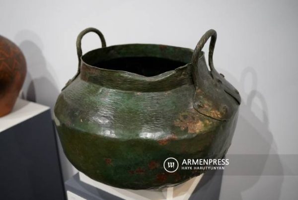 «Լայնաբերան է, կարճ պարանոցով, շրթնապսակն ուղիղ կտրած: Պարանոցի եզրակողերի վրա` բարձր աղեղնաձև տեղադրությամբ, գամված են երկու ունկեր: Ունկերը պարանաձև ոլորված են, հատվածքում` կլոր, ծայրերում տափակեցրած-հարթեցված: Ունկերի յուրաքանչյուր վերջույթի վրա մեխված են երեքական կլորագլխիկ գամեր: Կաթսայի շրթնապսակի մի հատվածը կարկատված է: Կարկատանն ամրացված է փոքր գամերով»,- նշեց թանգարանի հնագիտության և դրամագիտության բաժնի գիտաշխատող-ֆոնդապահը: