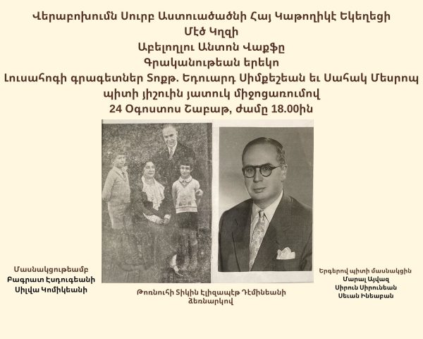 Վերջապէս այժմ կը պատրաստուինք 24 Օգոստոսի երեկոյեան ժամը 18.00-ին Մեծ Կղզիի Հայ Կաթողիկէ Եկեղեցւոյ մէջ յիշատակելու թէ՛ Եդուարդ Սիմքեշեանը եւ թէ տիկին Էլիզապեթի միւս մեծ հայրը՝ դարձեալ բանաստեղծ Սահակ Մեսրոպը։