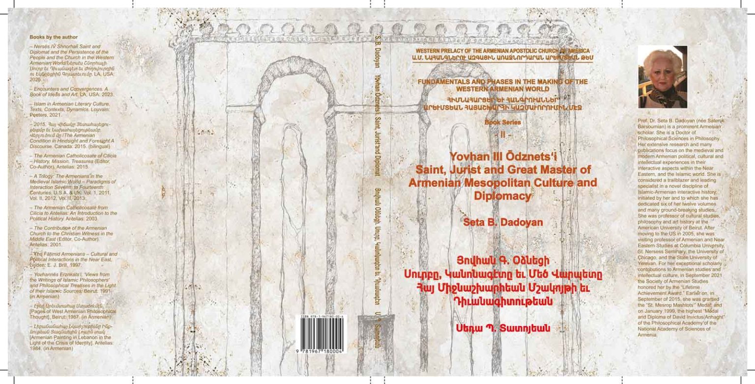 Լոյս տեսաւ «Յովհան Գ. Օձնեցի (իշխ. 717-728) սուրբը, կանոնագէտը եւ Մեծ վարպետը հայ միջնաշխարհեան մշակոյթի եւ դիւանագիտութեան»-ը, որ երկրորդ երկլեզու հատորն է Միացեալ Նահանգներու Արեւմտեան թեմի Ազգային առաջնորդարանի մատենաշարին` «Հիմնահարցեր եւ հանգրուաններ արեւմտեան հայաշխարհի կազմաւորումին մէջ»*: Առաջինն է «Ներսէս Դ. Շնորհալի սուրբ եւ դիւանագէտ եւ ժողովուրդին ու Եկեղեցիին գոյատեւումը արեւմտեան հայաշխարհին մէջ (2025)**: Մատենաշարին երրորդ գիրքը ընդարձակ ուսումնասիրութիւն մըն է (մամուլի տակ) անգլերէն լեզուով` Prolegomenon to the Millennial History of the Western Armenian World From ‘Kingdoms’ to an Awakening Politics and Culture ? The First Phase Tenth to Fifteenth Centuries.