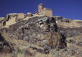 Çevrili bir avlunun içinde, birkaç binanın kalıntıları vardır. En önemli yapı, belki de 13üncü yüzyılda inşa edilmiş küçük, narin ve çok çekici bir kilisedir. Şimdi ise son derece güzel ve romantik bir harabedir – bir kayalığın doruğuna tünemiş, kırmızı taştan yapılmış küçücük ve şirin bir yapı.