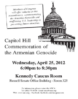ABD Ermeni kuruluşları Amerikan Ermeni Ulusal Komitesiyle işbirliğiyle ayrıca Kongre Ermeni dostu gruplar yanısıra Ermenistan ve Dağlık Karabağ Cumhuriyeti temsilciliği desteğinde 25 Nisan’da Capitolium tepesinde Ermeni Soykırımı kurbanlarına ilişkin bir etkinlik gerçekleştirilecek.