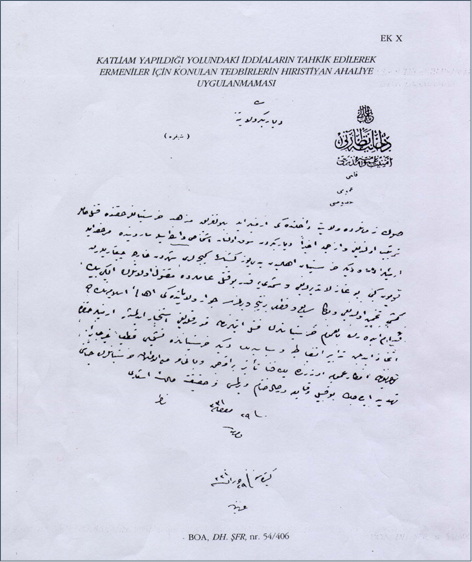 Ermeniler için düşünülen siyasî tedbirlerle (tehcir kararı), onların kontrol altında tutulmasına yönelik tedbirlerin, diğer hrıstiyanlara da uygulanacak şekilde genişletilmesi kesinlikle uygun olmadığından, kamuoyu üzerinde çok kötü etkiler bırakacak ve bilhassa bunun üzerine hrıstiyanların hayatını tehlikeye sokacak bu türden olaylara derhal son verilmesi ve gerçeklerin açıklığa kavuşturulması. 29 Haziran 1331 (29 Haziran 1915).
