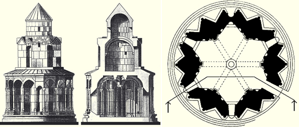 Zemin katın özellikle karmaşık bir yapısı varmış. Dıştan, 12 uçlu yıldızmış. İçinin altı nişi varmış. Nişlerin arasındaki dikey yüzey, bir demet gömme sütundan ibaretmiş ve her demedin tepesinden bir yarım daire kemer çıkarmış. Bu altı kemer, tavanın merkezinde birleşirmiş. Bu birleşmenin tam olarak nasıl olduğu kesin değildir çünkü yapının bu kısmı çökmüştür. Sarkaç (Havariler Kilisesi‘ndekinin benzeri) ya da da bir merkezi kolonla berkitilmiş olabilirmiş. Sarkaç, Toros Toromanyan’ın kilisenin burada temsil edilmiş modellemesinde kullandığı çözümdür.