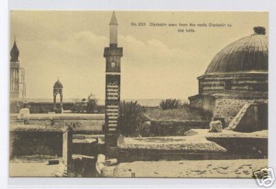 Ön planda görünen mimarı belli olmayan Şeyh Mutahhar (Şeyh Matar) Camisidir. Minaresi üzerindeki kitabesinden Akkoyunlu Sultanı Sultan Kasım tarafından 1500 yılında yaptırıldığı öğrenilmektedir. Minare dört kalın ve sade sütun üzerine oturtulmuş, Büyük olasılıkla bu minare sonraki dönemde camiye eklenmiştir. Mıgırdiç Margosyan’ın bahsettiği o ünlü gâvur mahallesi’nin hemen önünde bulunmaktadır. Şimdi ise “gavur” ‘ u gitmiş yanlız “mahallesié” kalmış.