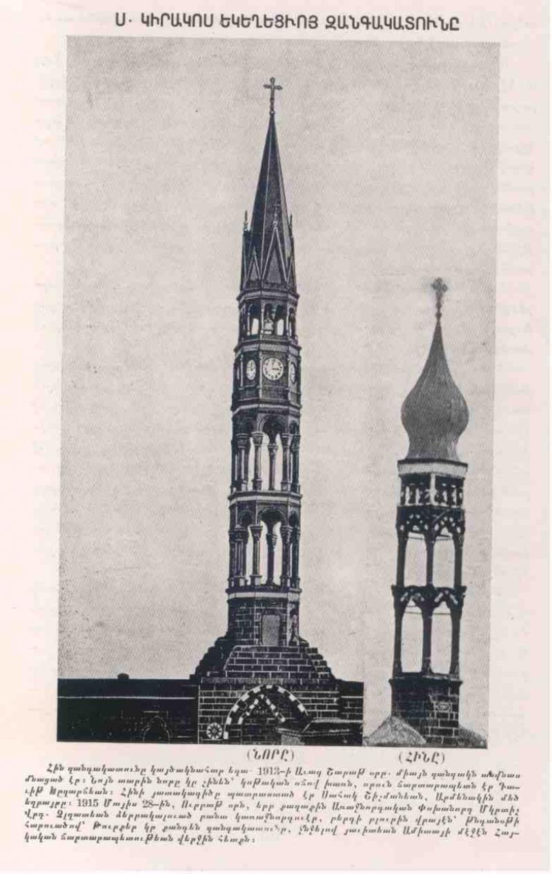 1913 yılında, Avak Şapat haftasinda düşen bir yıldırım sonucu yıkılmıştır. Aynı yıl içerisinde gotik tarzda, üç nesil mimar ve inşaat ustası olan mimar David Ghzaryan tarafından sekiz saati olan yeni bir çan kulesi inşa edildi. Kulenin içerisindeki çan, Ermeni toplumunun hibe ettiği altınlar ve bakır karışımıyla dökülmüş. Çan sesi Kırklar dağının daha ilerisinde Sati köyü olarak bildigimiz eski Ermeni köyünden duyulabiliyormus. O çan uzun yıllar kilisenin bir kenarında dururmuş, sonra bir şekilde yok olmuş ortalıktan.